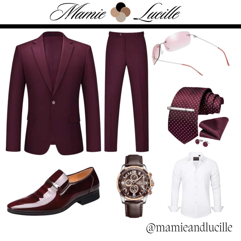 This two-piece burgundy suit provides a pop of color without sacrificing sophistication.