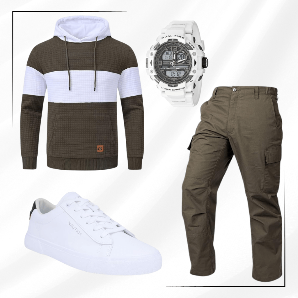 Take a brisk afternoon stroll in this army green and white outfit.